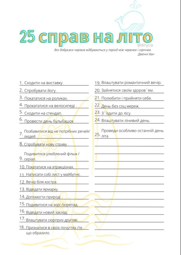 Літо — це не про те, щоб виконати всі 100 пунктів. Головне — щоб було весело, цікаво і безпечно. Вибирайте те, що подобається саме вам, і не бійтеся додавати свої ідеї до списку.Нехай ваше літо буде наповнене сміхом, новими вміннями, смачними моментами та справжніми пригодами!