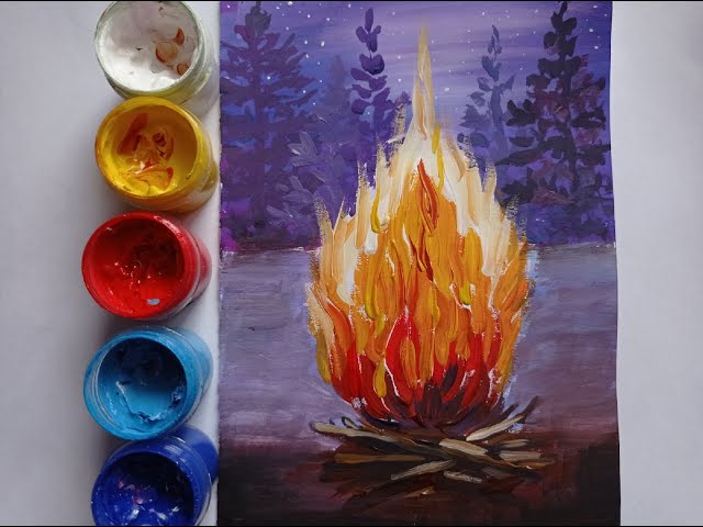 Для акварелі: змочіть папір, нанесіть жовту фарбу розтушовкою. Поки волога, додайте червону для градієнту. Синій чи фіолетовий на краях – для тіні. Аби намалювати вогонь легко фарбами, змішуйте кольори на палітрі. Жовтий + червоний = помаранчевий. Білий для відблисків.